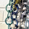 Blue raffia, paper twine, linen, pods, ceramic beads.